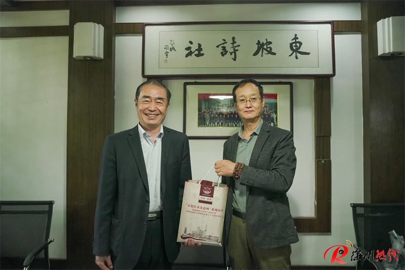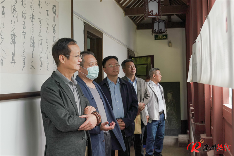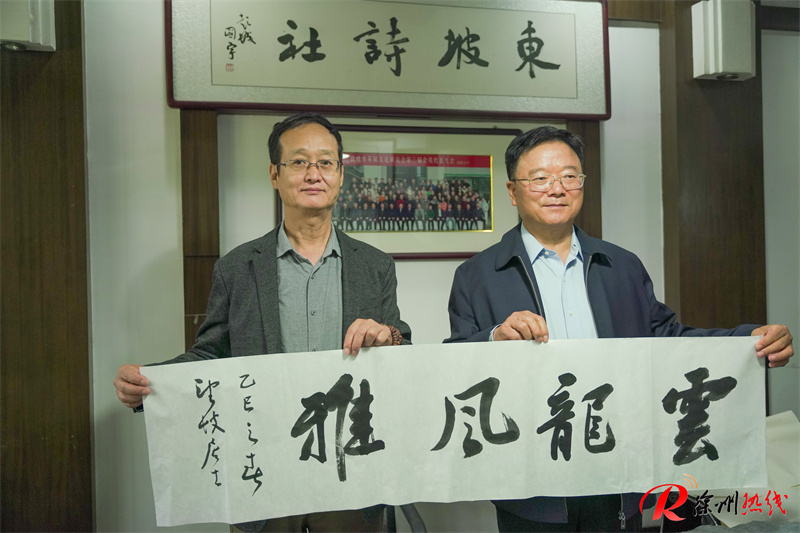 在陈新生会长陪同下,李景新教授参观了"千古风流苏徐州"主题文化展和东坡画廊"常德怀海"书画展,重点考察了苏轼知徐州年谱长卷等研究成果,对徐州苏学研究的深度和扎实的工作非常赞赏。