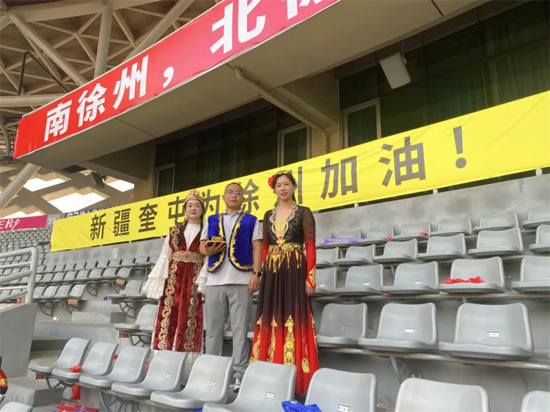 “远在他方的徐州亲戚来了!”新疆奎屯的球迷身着民族盛装为徐州呐喊助威,“徐州队踢得太精彩了,给徐州加油!”