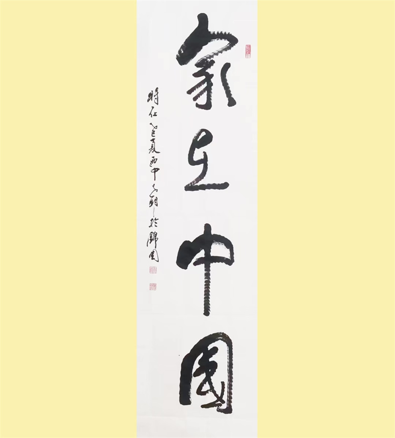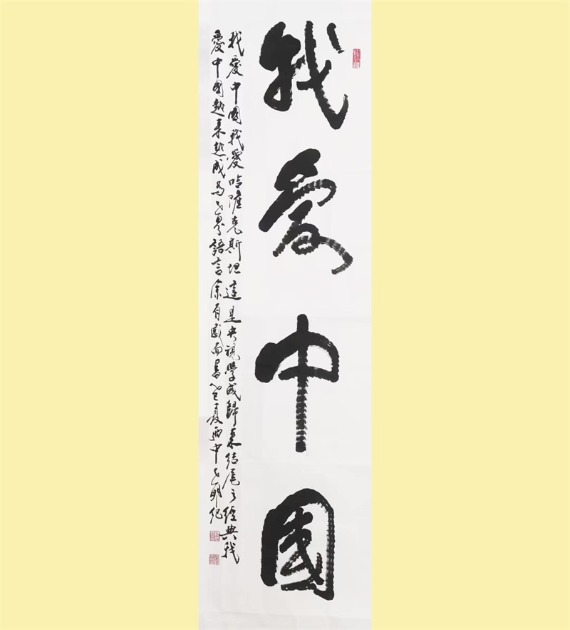 章法间见匠心:引首、正文、落款、印章次第排布,疏密错落如自然呼吸。传统布局里,暗合当代情感的奔涌:“我爱中国”