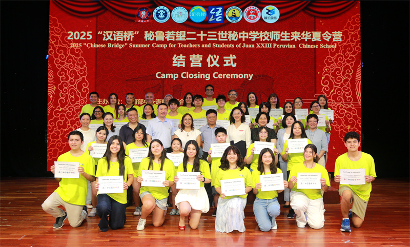 当太平洋的海风邂逅两汉大地的晨露,一场跨越山海的文化之约,于2025年6月26日-7月9日,在古彭徐州悄然绽放。由教育部中外语言交流合作中心主办、徐州高等师范学校联合徐州三所名校共同承办的秘鲁若望二十三世秘中学校师生“汉语桥”来华夏令营,让38名秘鲁师生,在楚韵汉风的浸润中,开启了一段解码中国两汉文明的奇妙旅程。徐州市教育局教师工作处处长李进强;徐州高等师范学校党委书记、校长苗苏莉;中国矿业大学国际学院副院长房坤;江苏模特艺术学校党委书记、校长李乐;徐州市鼓楼小学校长陈娟;徐州教育在线总监周燕青、智识国际总经理刘甜、若望二十三秘中学校校长詹妮弗(Jennifer Romy Pajan Lan )及夏令营全体师生共同出席了7月4日的夏令营结业典礼。营员们还参观游览了北京长城、颐和园,上海博物馆、外滩和古猗园。将东方古都的千年风韵、国际大都市的日新月异和中国师生的深情厚谊带回到了太平洋彼岸。