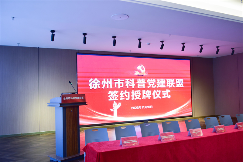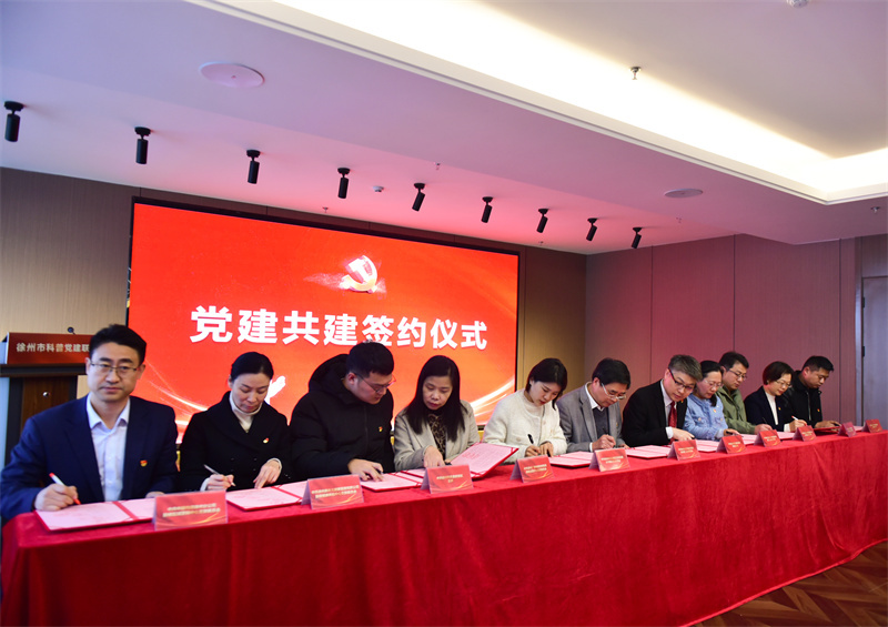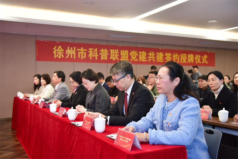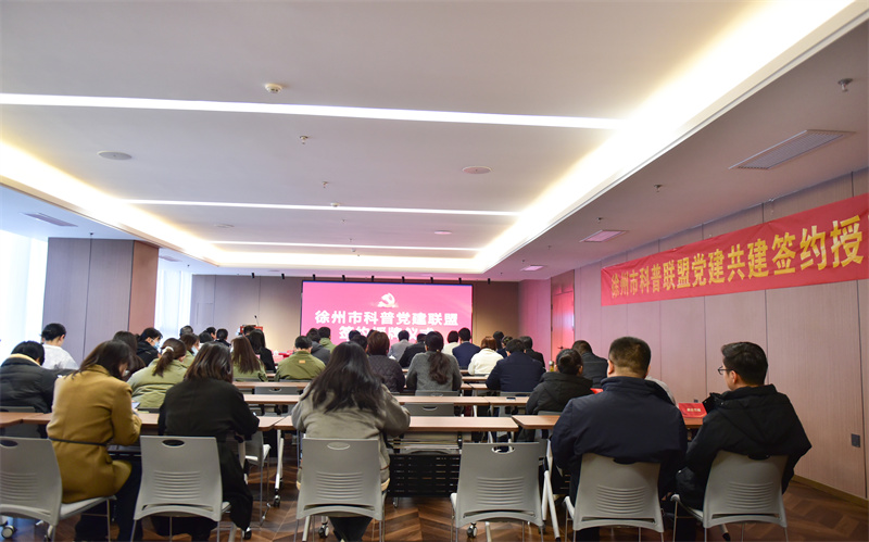 徐州市科协机关第二党支部、徐州爱尔眼科医院党支部、徐州市太行路社区党支部、徐州医科大学麻醉学院党委教工第二党支部、徐州广播电视传媒集团商务运营中心党支部、徐州市公园管理服务中心动物园党支部、徐州欧乐堡度假区党支部、徐州市妇幼保健院行政第二党支部、徐州美年大健康鼓楼健康体检中心党支部、徐州正博口腔医院党支部、中国电信徐州分公司鼓楼区域营销中心党支部11家单位共同签订科普联盟党建共建协议并授牌。签约授牌仪式后全体党员重温入党誓词。