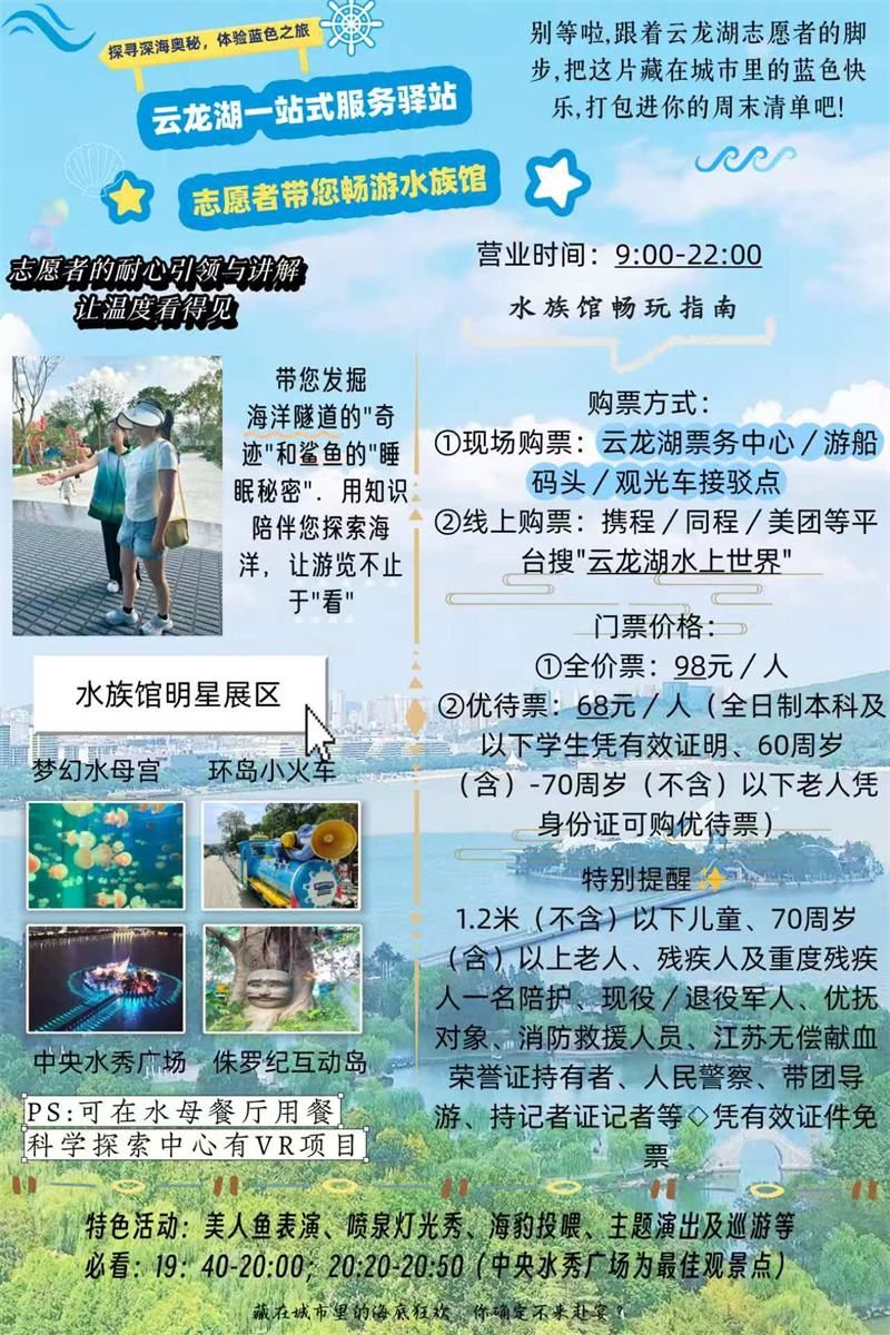 我们始终认为,志愿者驿站的价值不仅在于提供基础服务,更在于成为连接群众与美好生活的纽带。如今推荐水族馆,更期待为每一位到访者提供独具一格的惬意与惊喜。别等了,这个八月,跟着我们云龙湖景区志愿者的脚步,一起畅享这片藏在城市里的蓝色快乐吧!