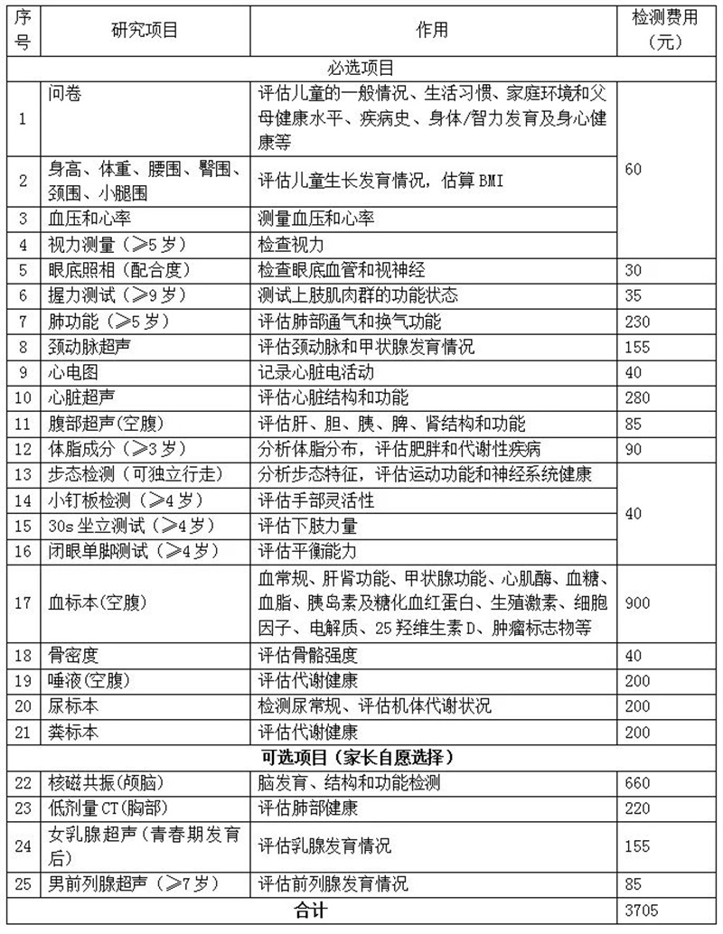 参与队列的儿童享受价值3705元免费体检及连续5年免费健康管理项目(具体健康管理项目据医院实际情况进行),各年龄组(1-3岁、3-6岁、6-12岁、12-18岁)男孩女孩各招募50人,额满不再接受报名。
