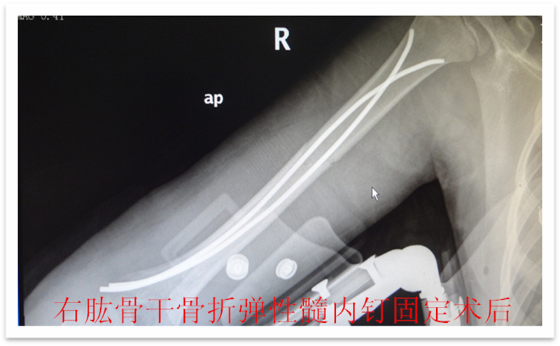 儿童四肢骨折较为常见,保守治疗仍是儿童骨折的重要 治疗方法之一,如牵引,单纯石膏固定等。 往往用时较长,患儿的舒适程度不够,影响患儿及时返回学校学习,这些因素越来越多地影响儿童骨折治疗方法 的选择 。儿童骨折手术治疗的比例较前增加,而传统的手术治疗创伤大,恢复慢,并发症多,如钢板,那是针对成人骨折研发的,用一个坚硬的内固定物固定一个有弹性的骨组织是一个矛盾 ,弹性髓内钉内固定解决了这个矛盾。有人说,弹性髓内钉的出现是上天对儿童的恩惠。的确,弹性髓内钉是治疗小儿长管状骨骨骨折的一种理想、可靠的内固定方法。弹性髓内钉技术发源于法国,在欧洲广泛应用后,现已为全球所接受,被称为是儿童骨科界的一次革命。徐州儿童医院骨一科应用弹性髓内钉技术治疗四肢长管状骨骨折,具有创伤小、恢复快、并发症相对少,孩子能较快恢复正常生活、学习等优点。该技术先将骨折闭合复位,通过微小的切口将特制的弹性髓内钉置入骨髓腔,达到固定骨折的目的。适用于肱骨,股骨,尺桡骨等部位的常见骨折(图)。