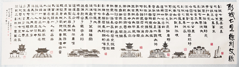综观整幅画作,长达5米,宽达1.2米,内容包括诗书400多字,景观8处,印章8方,布局精当,相得益彰,蔚为壮观。就诗而论,此诗是我市诗人柳振君先生的力作。作者以诗人的眼光、哲人的思辨,阐释了彭城七里既短又长、既小又大的深刻内涵:它于七里之内,串起徐州千年文脉,彰显徐州各个历史时期的辉煌,寄托着全市900万人民的智慧、梦想和期望。就书而论,标题“彭城七里千年文脉”8个大字,由我市书法家杨世明先生用可染体书写,朴厚稳健,凝重遒劲。诗文由我市主攻隶书的书法家王伯众先生书写,全文400余字,一气呵成。笔势浑厚、意态高古、端庄厚重,深得汉碑神韵。就图而论,8处景观从南到北依次为下圆墩遗址、云龙山、乾隆行宫、戏马台、回龙窝、快哉亭、文庙街区和黄楼,可以说是典型概括。作者为我市著名画家、雕塑家刘永钧先生,笔墨简练而形象。就印而论,每方印长宽5公分,印文风格为汉印篆,端庄而规整,方寸见天地。内容对应景观名称,一景一印,一黑一红,相映成趣。作者为徐州篆刻名家王昭鹏先生。上述五位作者,其中有两人年龄超过80,另外三位也是古稀有余。可谓老当益壮,精神可嘉。