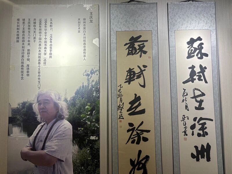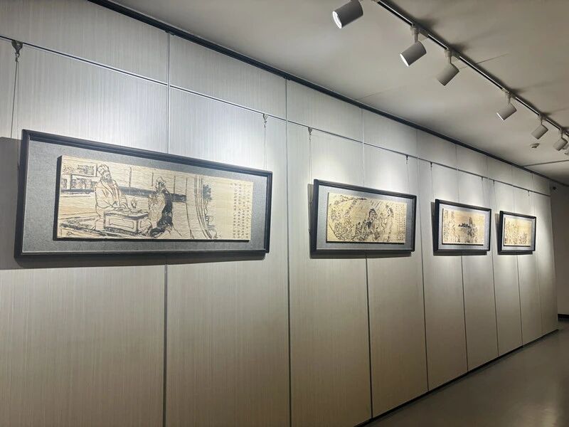 随后,在木刻版画艺术家王庆龙老师的亲自带领下,走进书画展厅欣赏“苏轼在徐州”系列版画作品。透过精妙的刀法与墨韵,直观感受苏轼在徐州的历史瞬间与精神风貌。
